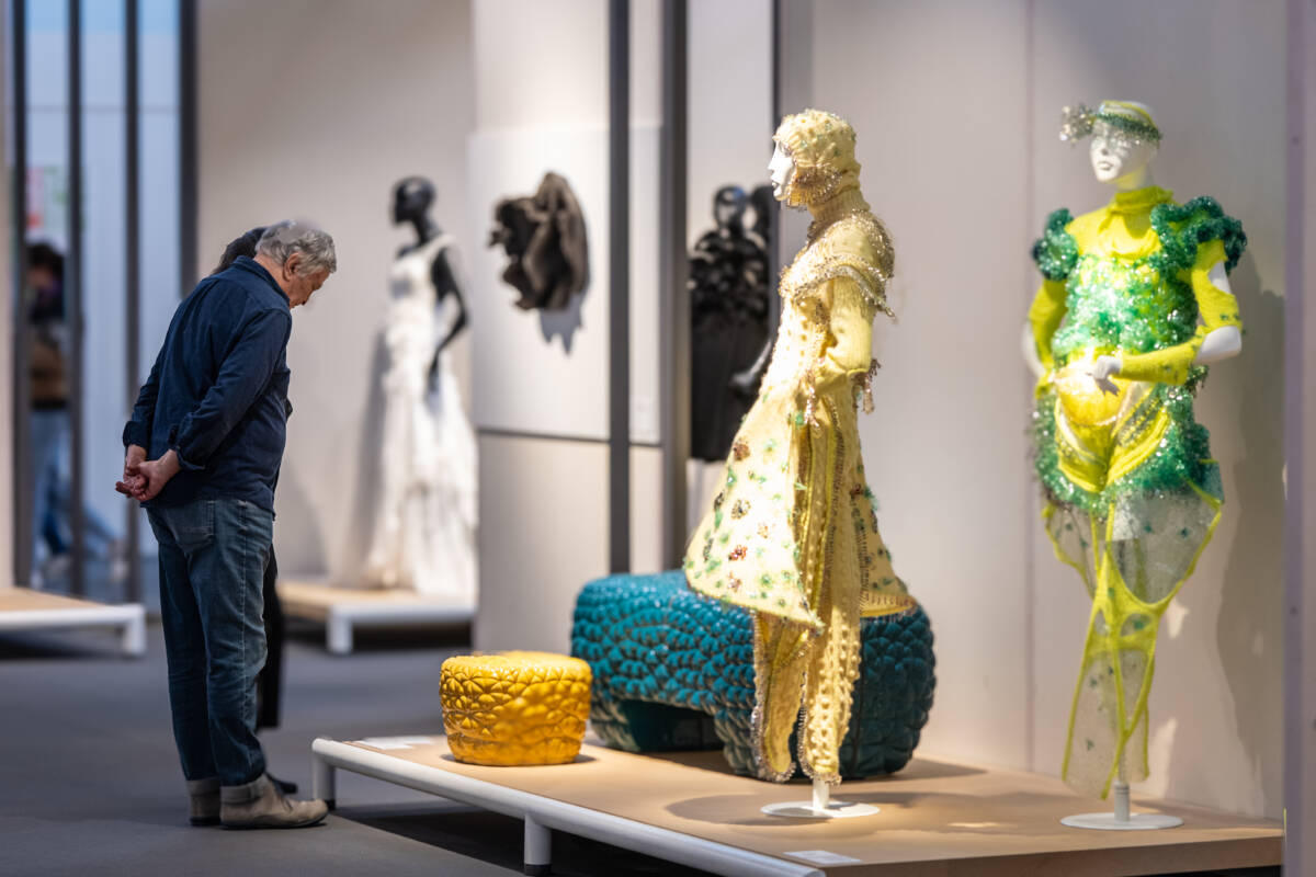 Textilien spielten auf der Sonderschau „TALENTEmünchen – Meister der Zukunft“ seit jeher eine herausragende Rolle. Die Vielfalt an Materialien, Techniken und Funktionen war auch im Jahr 2025 wieder beeindruckend. Von kleinen Stoffmusterproben über fertige Kleidung bis zu großen Wandbehängen oder Skulpturen aus flexiblen Textilien war alles dabei. Technisch reichte das Spektrum von traditioneller Textilbearbeitung bis zu computergesteuertem Weben und Stricken. Ein wichtiges Thema war das Upcycling von Stoffen und Garnen sowie der Einsatz von Textilien zur Raumgliederung und Schalldämmung.