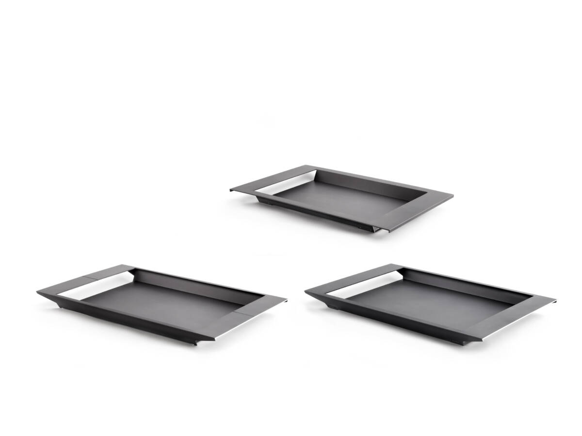The trays by Christoph Weißhaar are characterized by an innovative pattern concept. The three-dimensional shapes are developed from the surface. They are created by milling and folding the sheet metal with very small radii. The result is a light, functional tray with a strict geometric appearance.