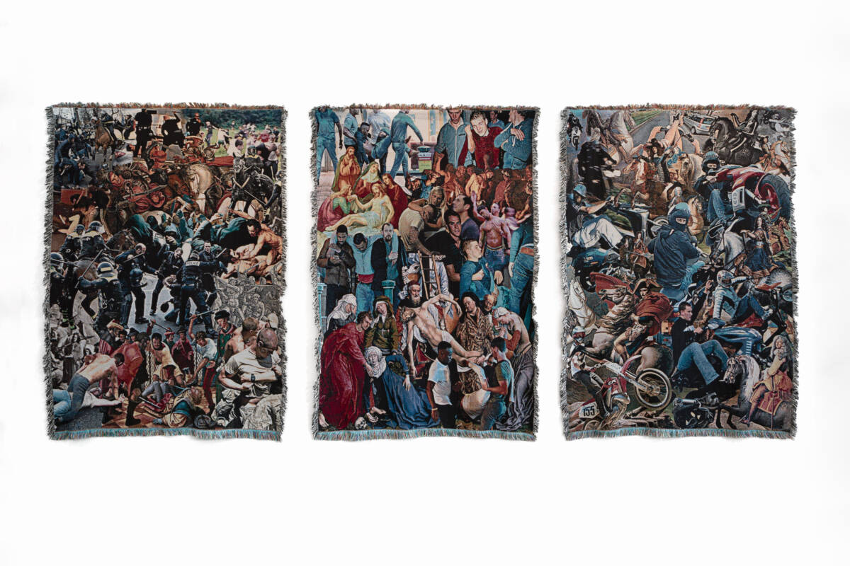 In his wall hangings, whose arrangement refers to the form of the Christian triptych, Jeroen van den Bogaert explores the concepts of masculinity. The focus is on toxic masculinity with its emphasis on violence. Jeroen von den Bogaert underlines the ambivalence of rejection and fascination of this idea of masculinity and at the same time, by combining contemporary photographs and historical motifs, points out how little change and development has taken place with regard to certain patterns of behaviour.